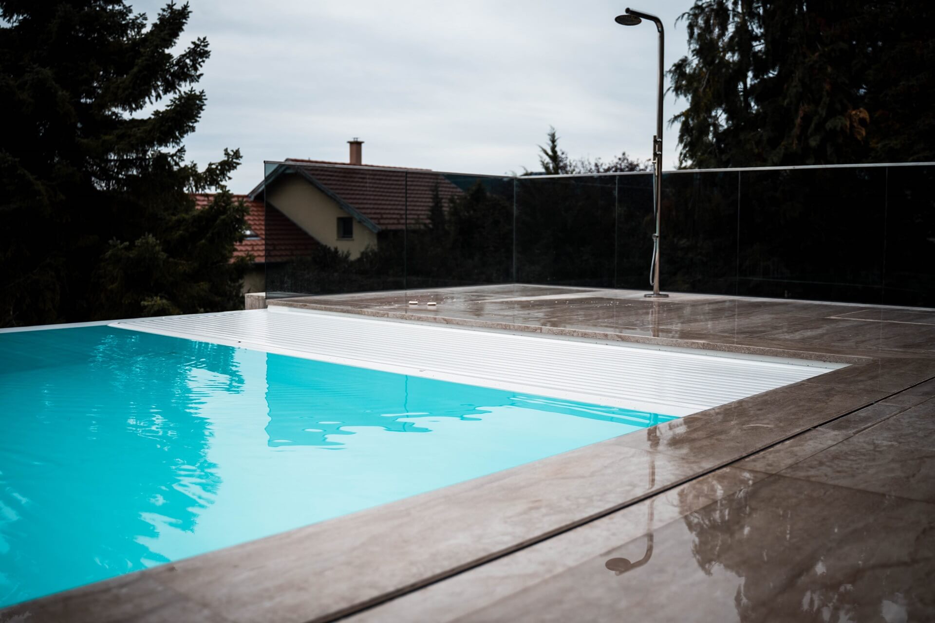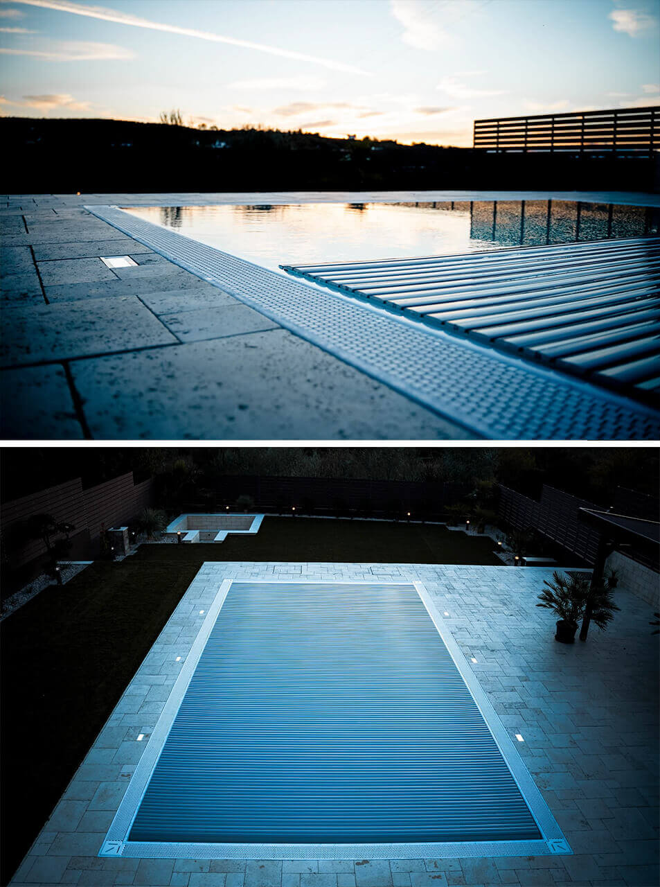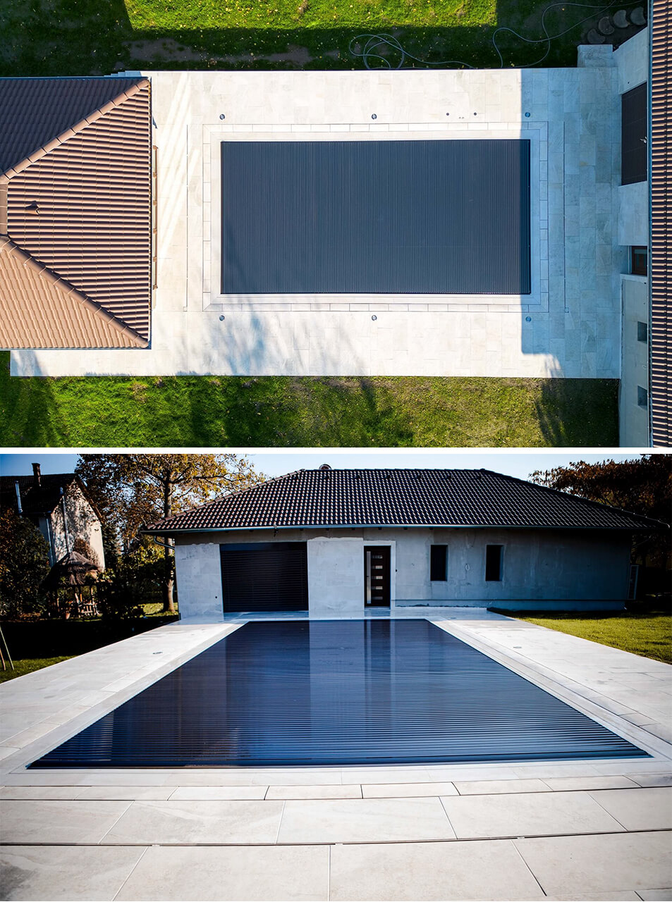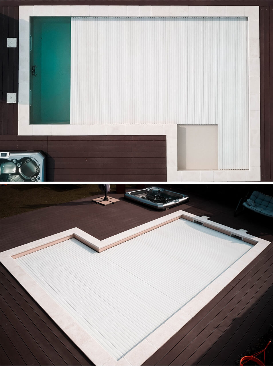 AquaTop rolós medencefedésünk beilleszthető bármely környezetbe. Elegáns, nem emelkedik ki a környezetből, nem keletkezik külön építmény a medence környezetében, mint a polikarbonát medencefedés típusnál. Szépen, gyengéden fekszik a víz felszínén. A lamellák színe választható, elérhető többek között fehér, bézs, fekete, alumínium, átlátszó, kék, titánium, arany. Teljesen automata működésének köszönhetően a legkényelmesebb medencefedés típus.