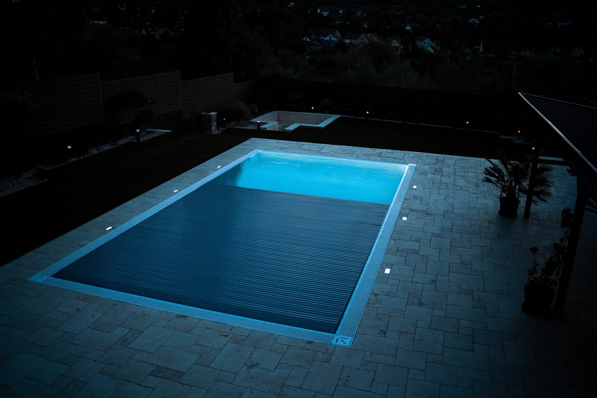 A roló feltekerve a medence oldalfalában kerül elrejtésre.