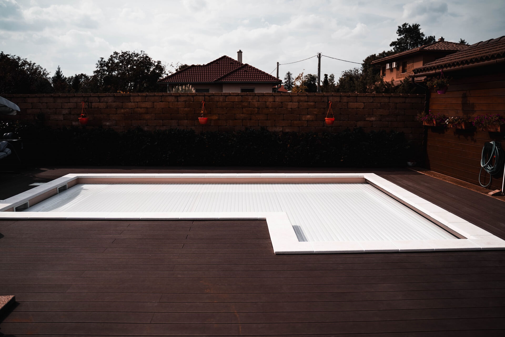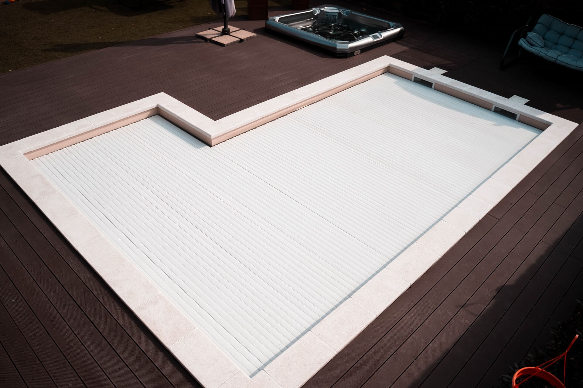 A roló kamra esztétikusan elrejthető egy napozó, pancsoló részbe vagy ülőpadba.